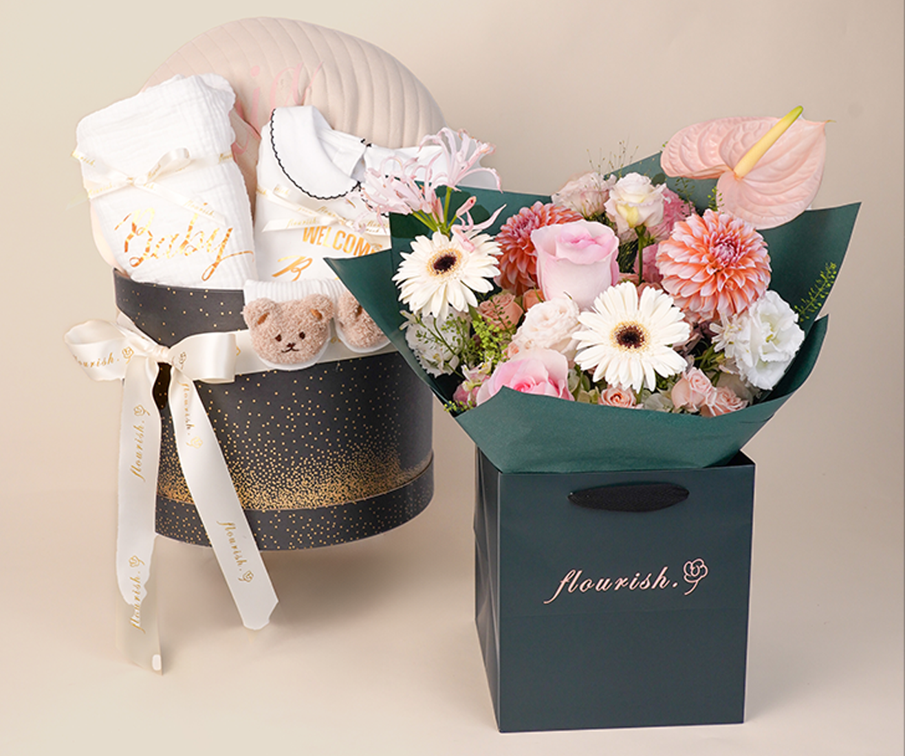 We specialize in a wide range of floral and gifting services, including handcrafted Bouquets, stylish Vases, personalized Bespoke arrangements, enchanting Wedding florals, romantic Valentine collections, and adorable Baby Hampers for welcoming new beginnings. Whether you’re expressing love, gratitude, congratulations, or sympathy, Flourish is here to help you say it beautifully.