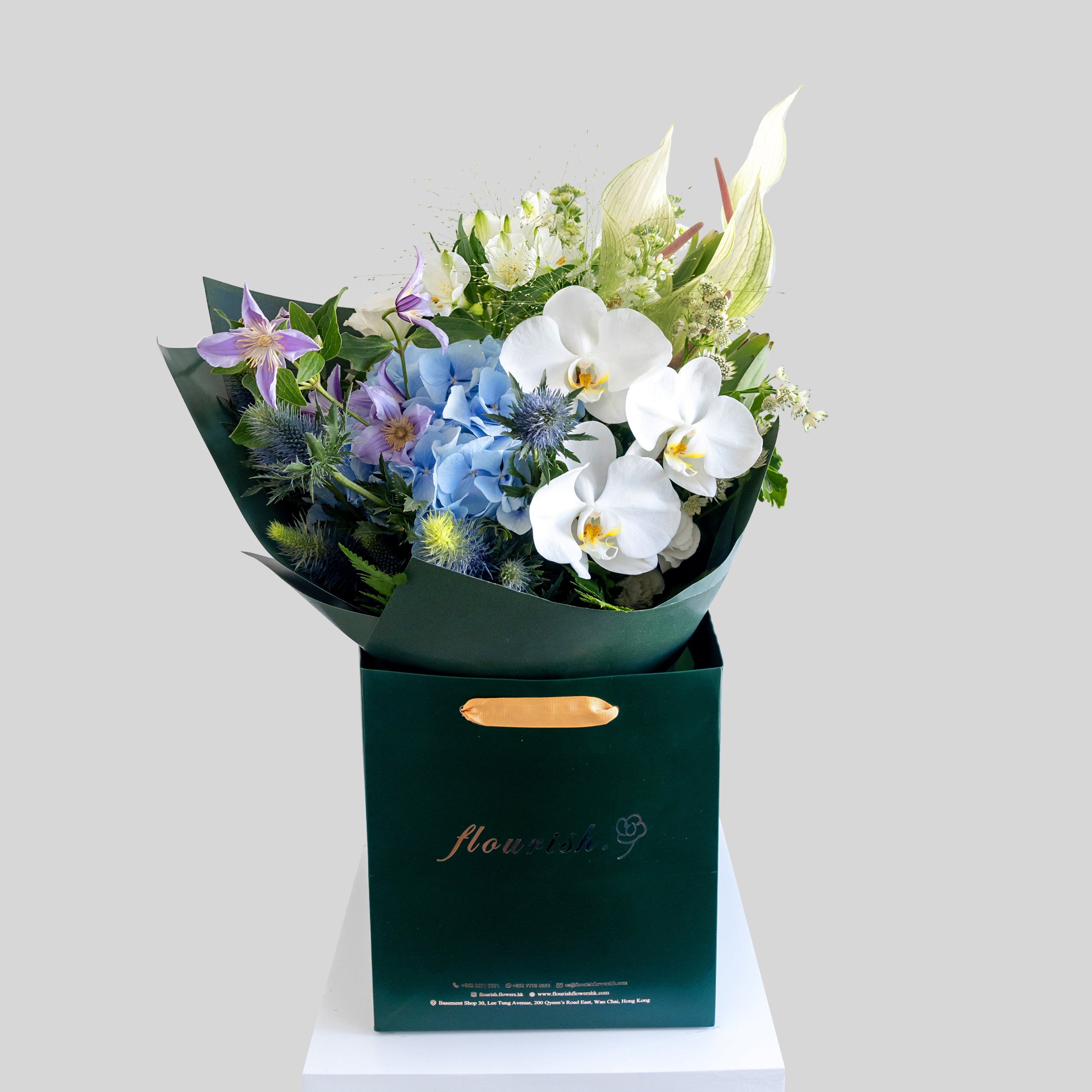 The Butterfly Garden bouquet, an elegant piece with white orchids, blue hydrangea, and purple clematis, is like butterflies dancing over a serene pond in a middle of a garden. This bouquet is an ideal gift for anyone, adding a touch of whimsical beauty to any occasion.