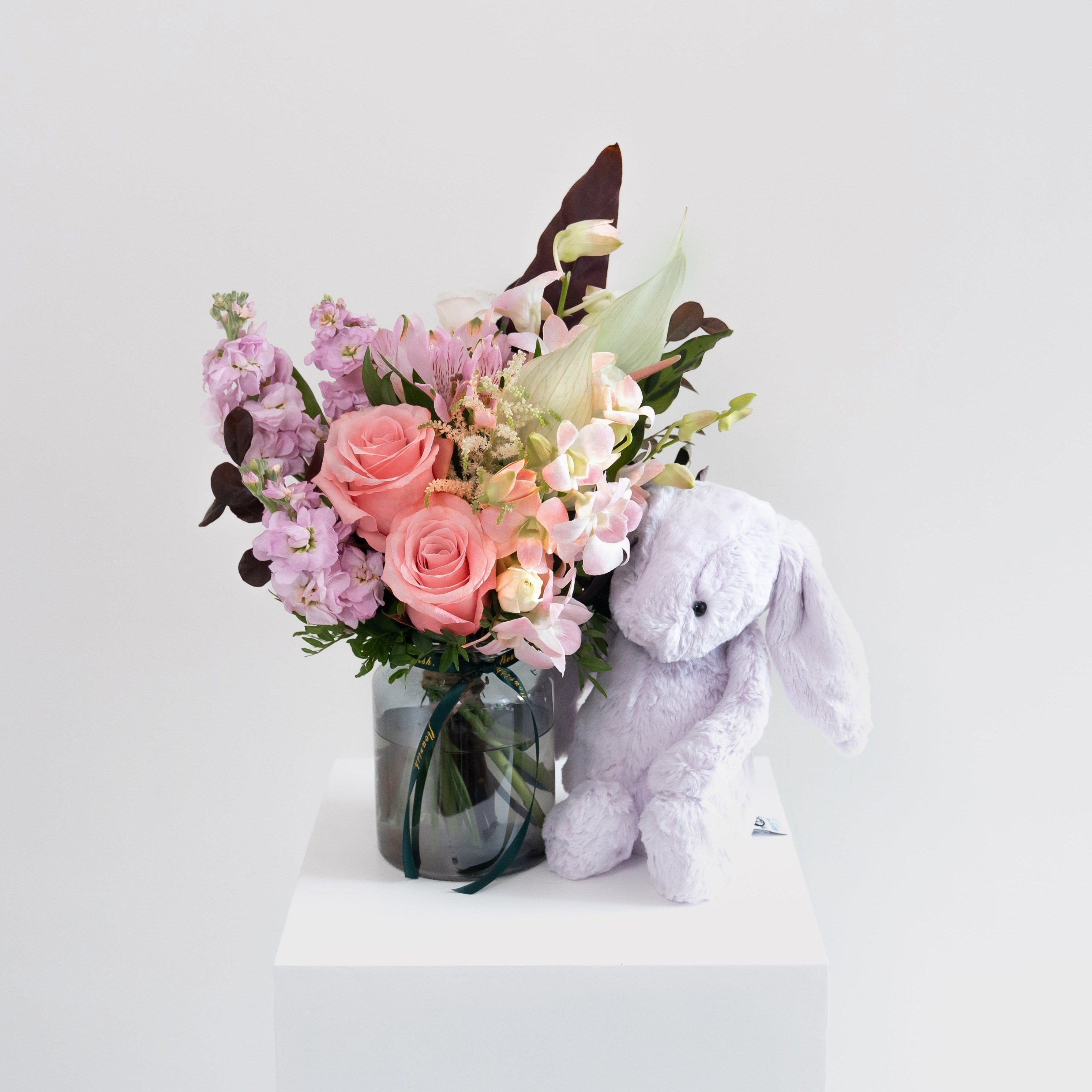 Welcome your precious little one with our exquisite Strawberry Swirl vase, elegantly paired with a cute Jellycat stuffie. This arrangement beautifully combines soothing baby pink and lilac hues, creating a harmonious blend of sweetness and joy.