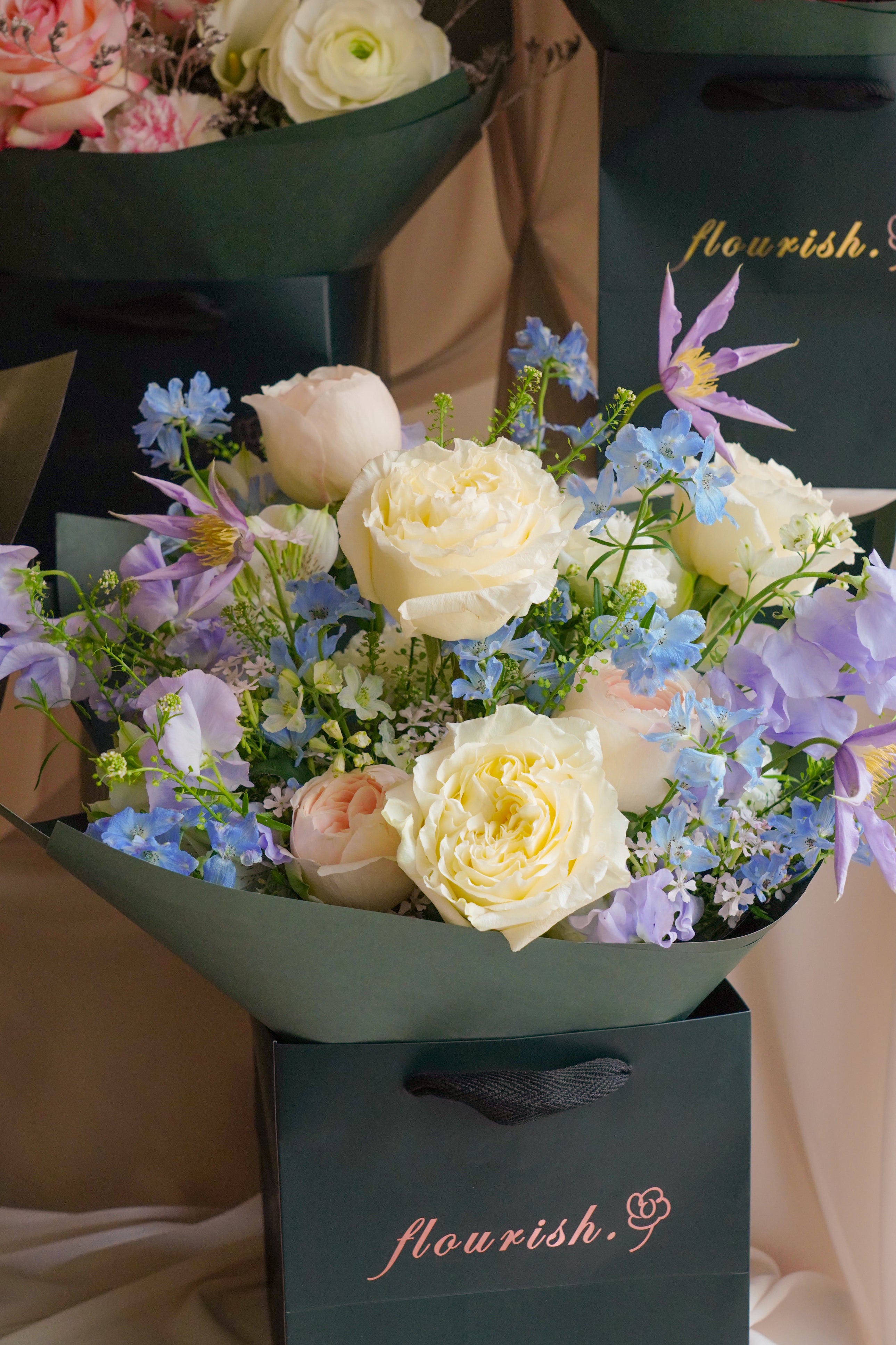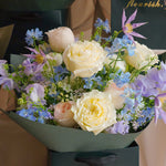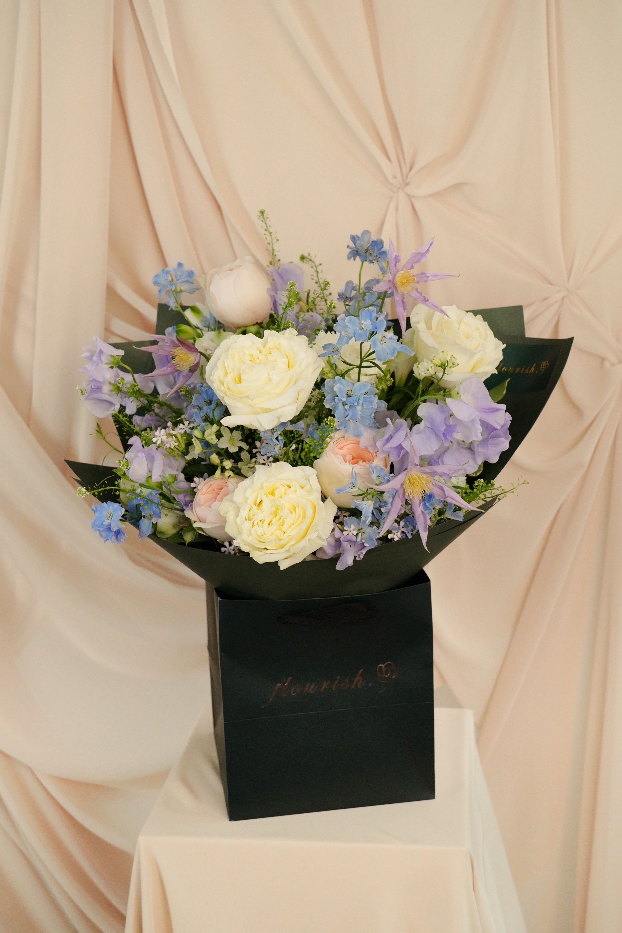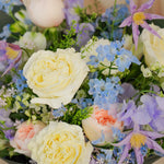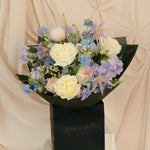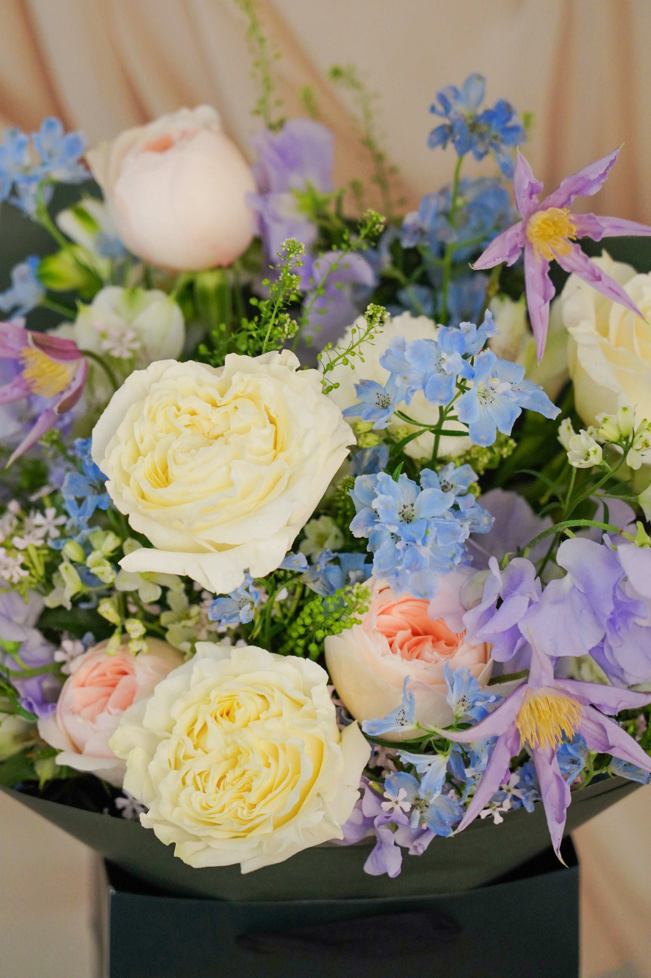 Secret Meadow - a soft pastel bouquet of white and peachy roses, accented with blue delphinium and purple clematis, creating a girly, dreamy, and innocent aesthetic. So gentle and poetic, it's a like a quiet fairytale in bloom.