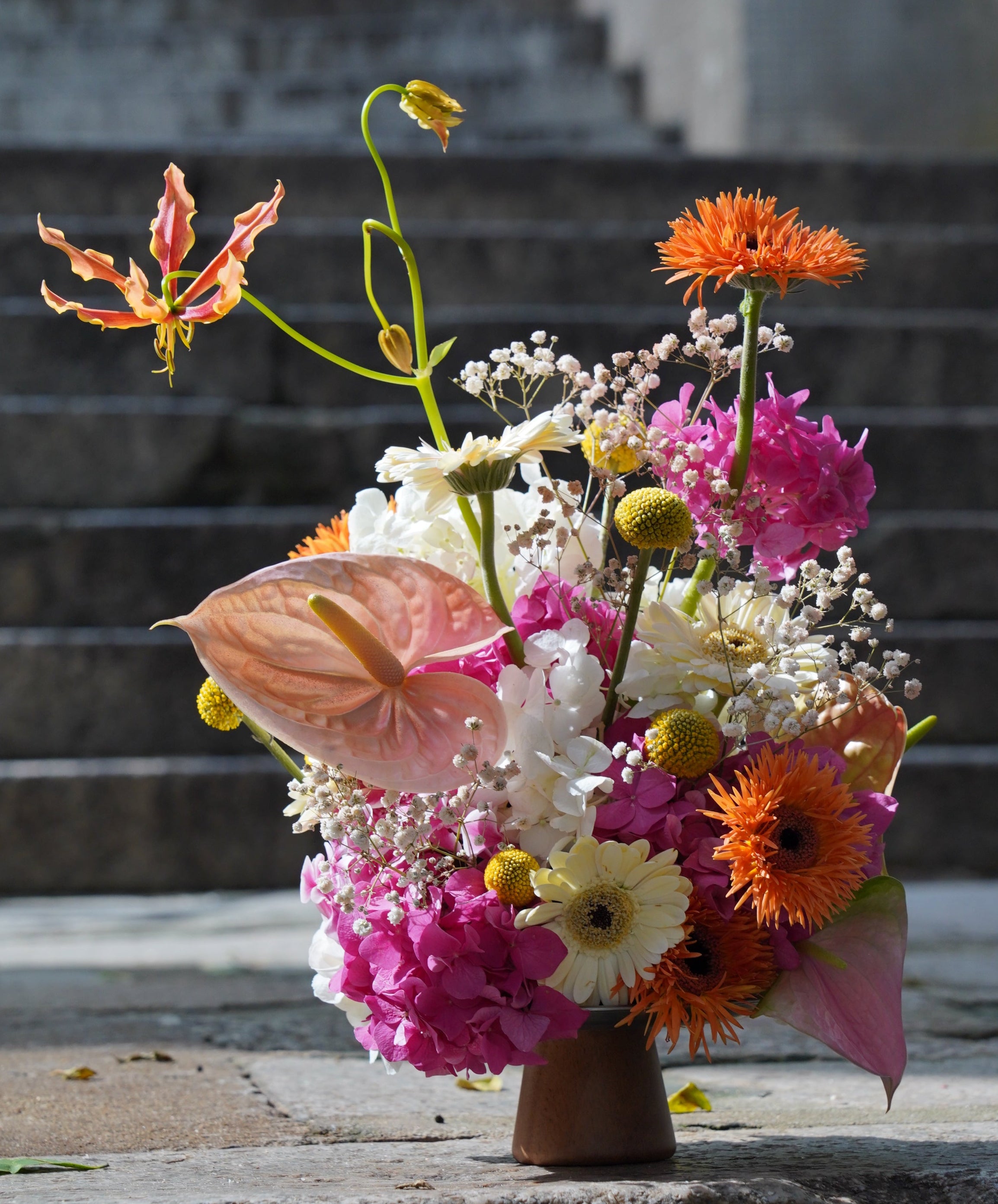 At our workshop, we focus on teaching the techniques and formulas for creating beautiful arrangements while also celebrating creativity. That’s why we don’t limit the types or number of flowers our customers can use. Instead, we encourage everyone to express their unique sense of art, shaping the tones, forms, and vibes of their arrangements.