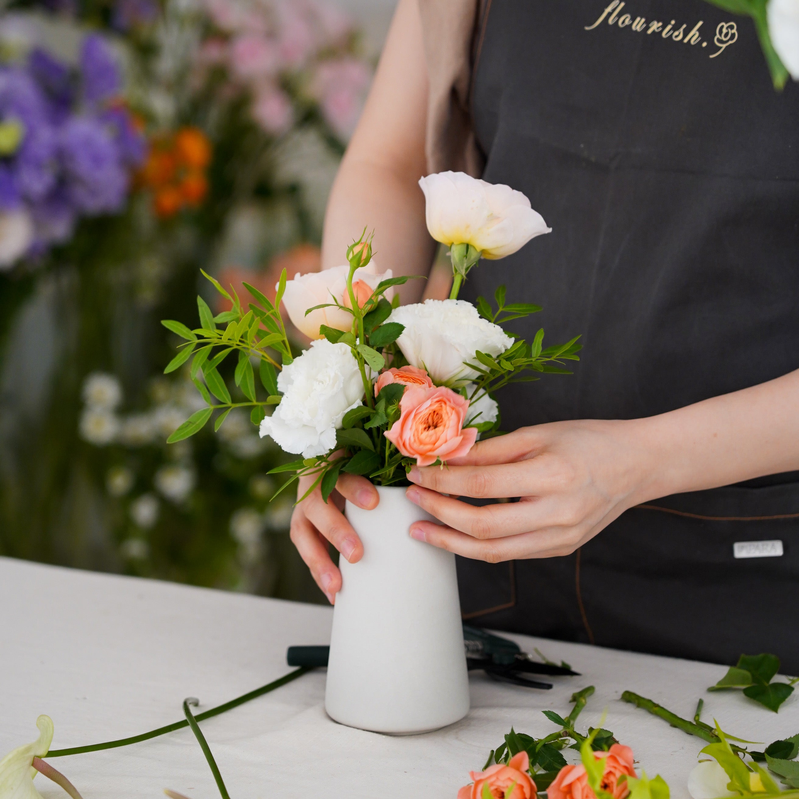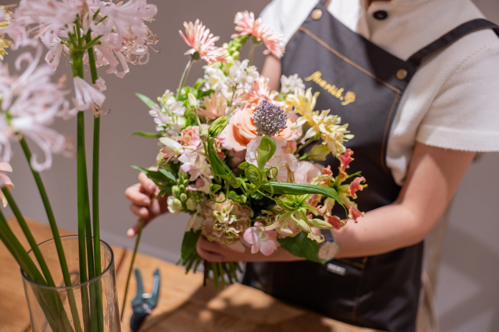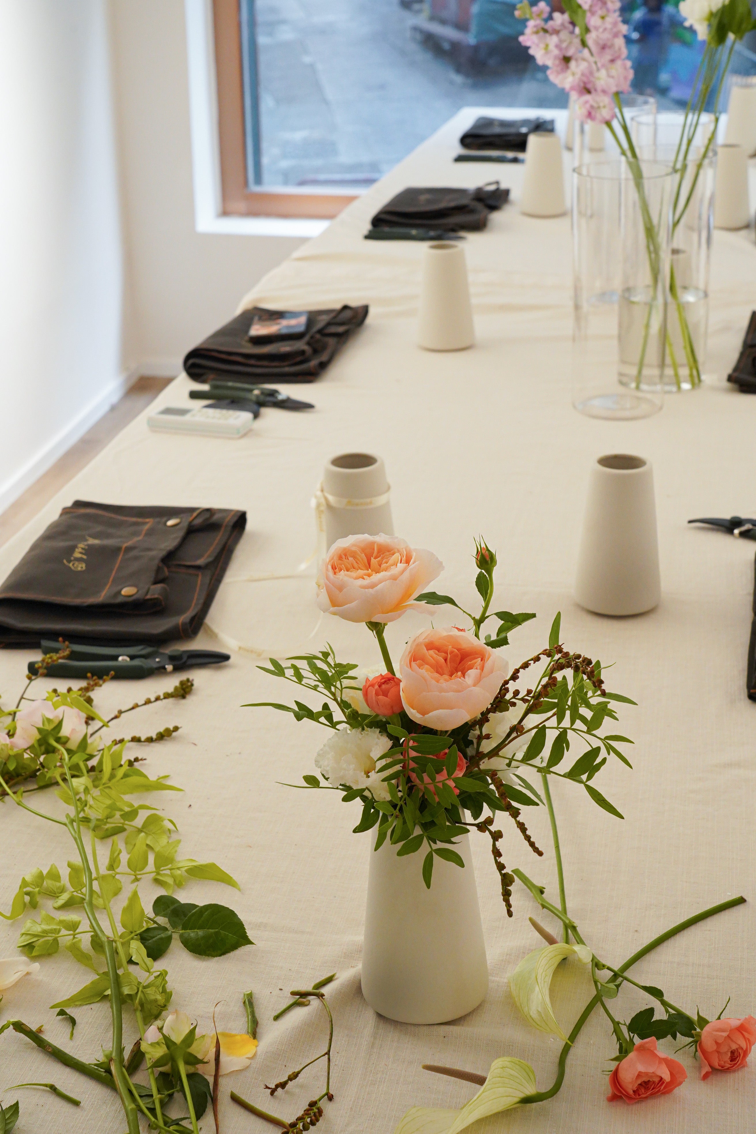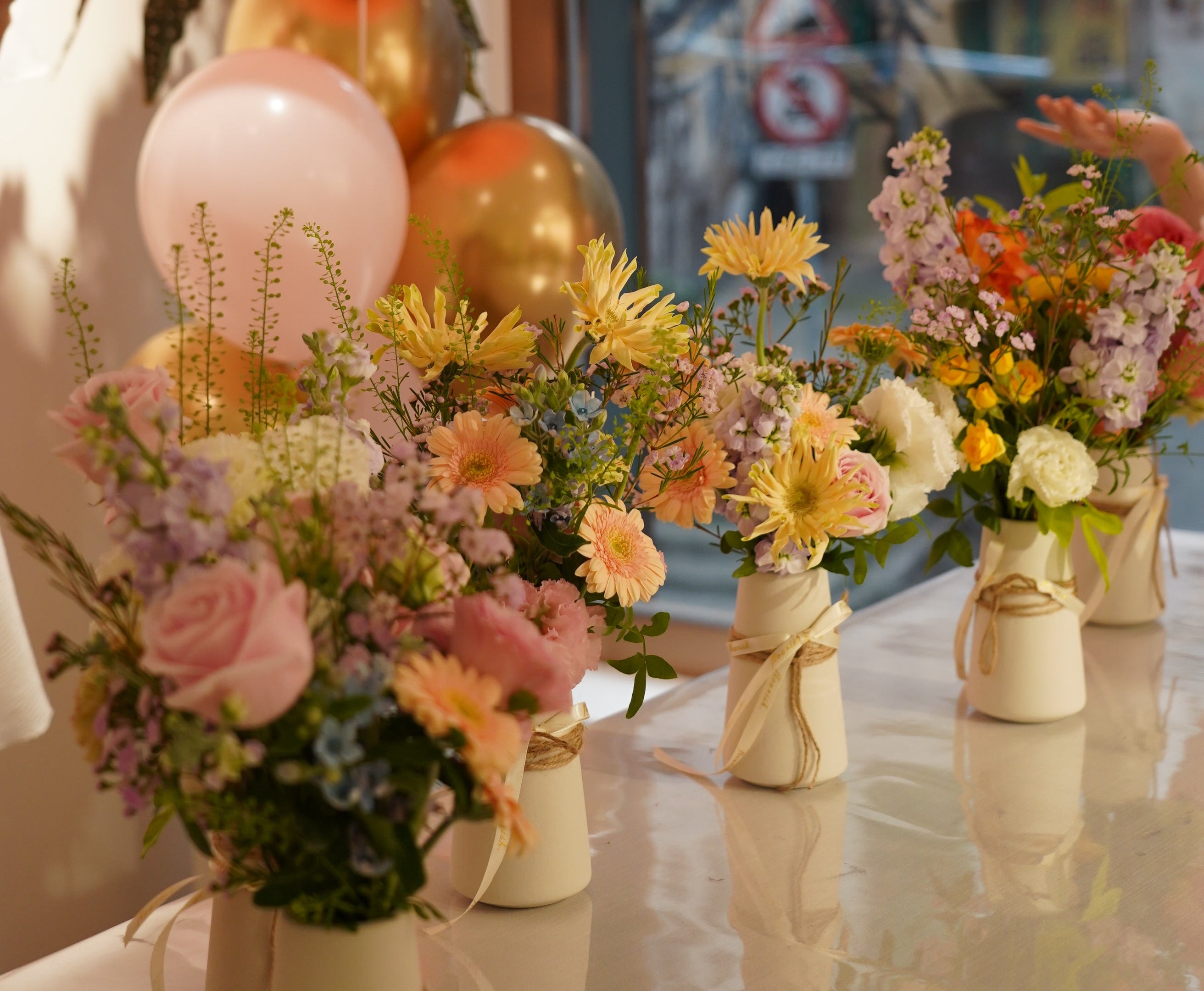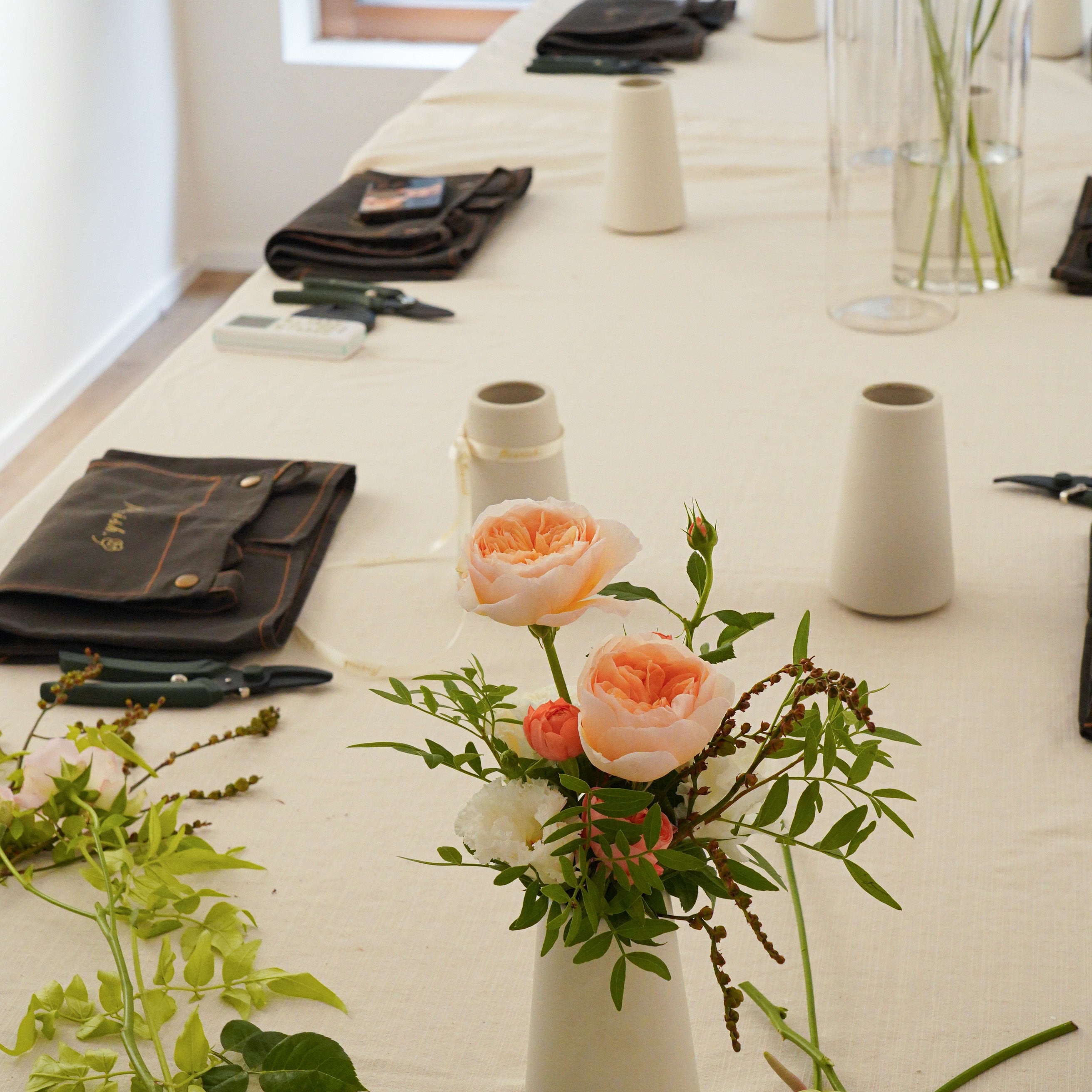 At our workshop, we focus on teaching the techniques and formulas for creating beautiful arrangements while also celebrating creativity. That’s why we don’t limit the types or number of flowers our customers can use. Instead, we encourage everyone to express their unique sense of art, shaping the tones, forms, and vibes of their arrangements.
